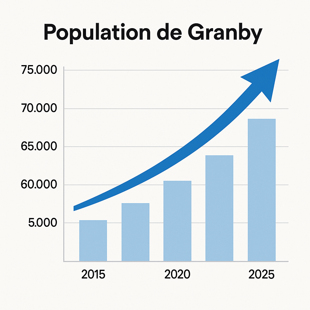Granby est en pleine expansion. Avec plus de 75 000 habitants en 2025, la ville affiche une croissance d’environ 12 % en une décennie, bien au-dessus de la moyenne de plusieurs municipalités de taille comparable au Québec.